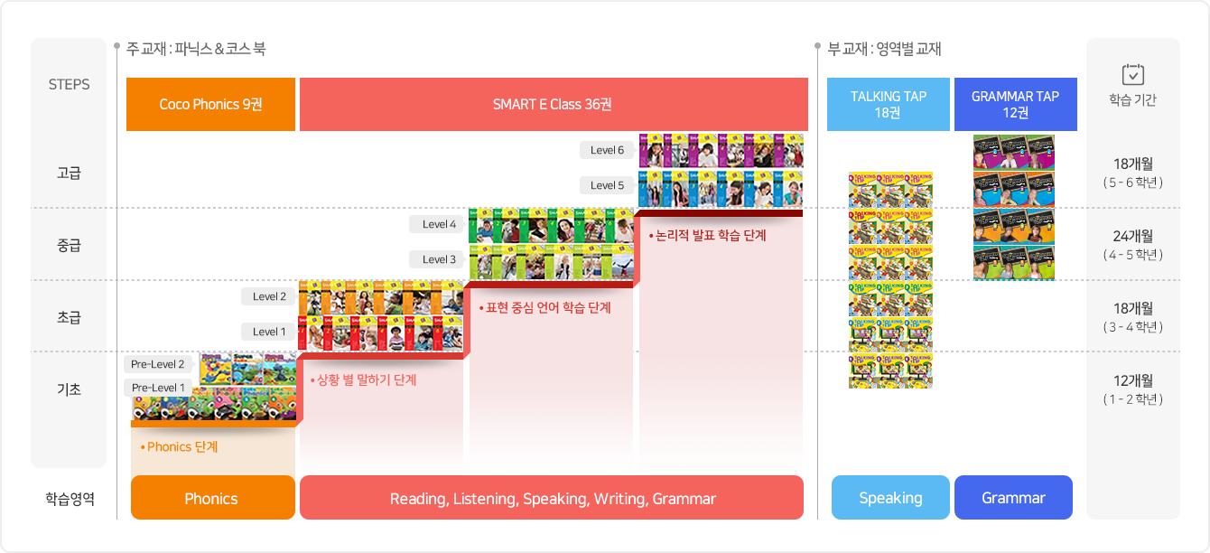 초등 1학년 ~ 6학년 대상 4단계 8개 레벨 72개월 과정!